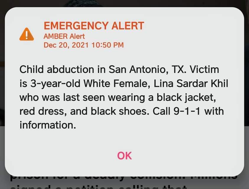 The SAPD continues an active and all hands on deck search for missing child, Lina Sardar Khi. At this time, we continue to ask for the public’s assistance in providing any information on Lina’s whereabouts to call 210-207-7660."