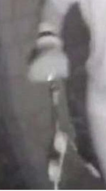 Here's a more clear photo of the woman's right arm. The device attached to it is thin like a tiny dog's leash and divided into two pieces with something rectangular attached to the end of it.