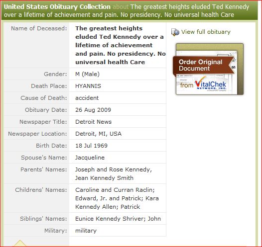 Speaking of which, look at this odd obit from ancestry. Note the DOB for Ted K is July 18, 1969, which as you pointed out was that fateful day when the terrible accident occurred, while the nation nervously awaited the moon landing.
