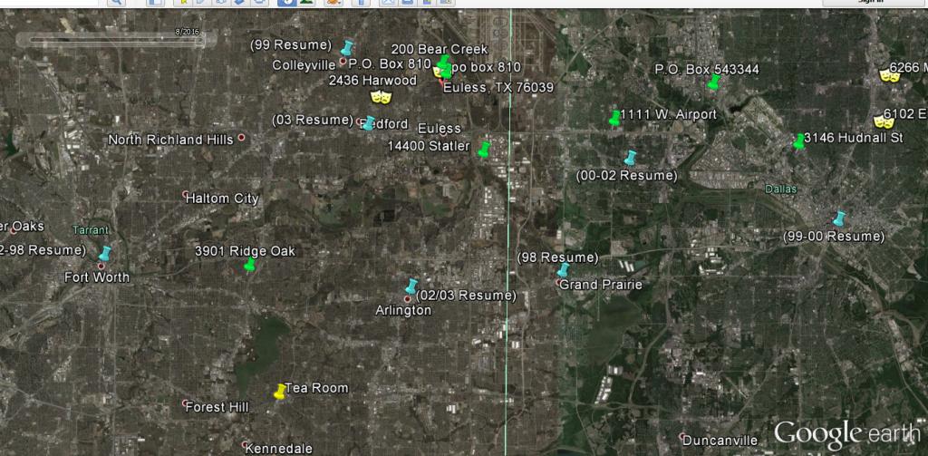 The Mockingbird and Melody Address are a little cut off, as I don't have a bit enough screen to capture the full names (but they are in the top right hand corner). Resume from Ft. Worth is a little cut off too it should be 92-98, but you can only see 2-98. I couldn't zoom in the map, because I then lost important details like the PO Box 810 was jused for the Application for Federal Student Aid as well as found with a google search.