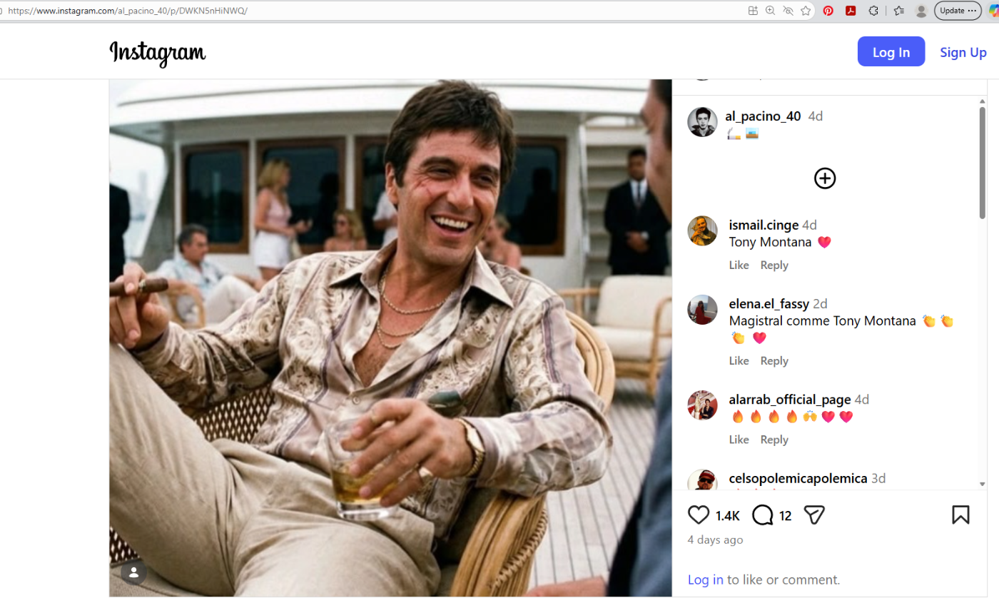 I wonder if this is the photo from which the elusive tattoo originated "Right anterior shin: Al Pacino Scarface character holding glass of whiskey and cigar."