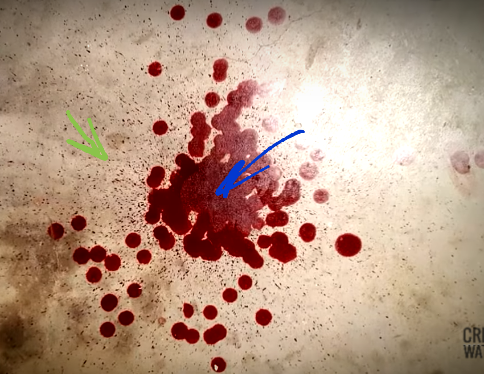 Hopefully you can detect the different areas of the blood in this photo. The blue arrow is pointing to the part that looks rough almost like a pebbled surface like it may be foamy, blood droplets with air mixed. The green arrow is the spray which I thought at first was just little tiny splashes from the larger drops but that area marked with my arrow doesn't have any large drops, it is just spray. If it was expelled through the mouth it would have strings of saliva. I wonder if that was tested. Anyway it's odd how there are differences in the blood all in one spot.