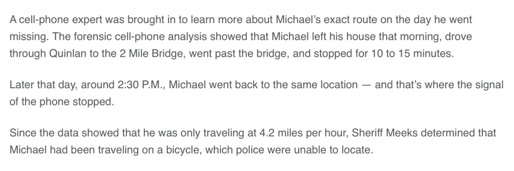 This part of the Disappeared episode didn’t make sense to me. I don’t have an explanation unless someone asked him to meet over there but didn’t show up (so that the phone shows he was there). But I don’t think he was killed (around the time of the Walmart trip) where he was found for three reasons. First, why then would you stage the crime scene at the house and draw attention to that location? Second, how does one explain the bloody dowel? Where does that fit in? Third, when he went to Walmart at 11am, he surely didn’t have a bike with him, right? I think that the Walmart trip was a way to get him off the property. The garage was the crime scene, in my opinion. It’s the only thing that makes sense to me. I do think this crime shows someone went to a TON of planning. I know you hypothesized that someone rode the bike to that location but that just seems REALLY risky and unlikely for that reason. Who knows though? I never thought we’d hear about a bike again and I was wrong! Let’s pray these investigators can figure this one out!!!
