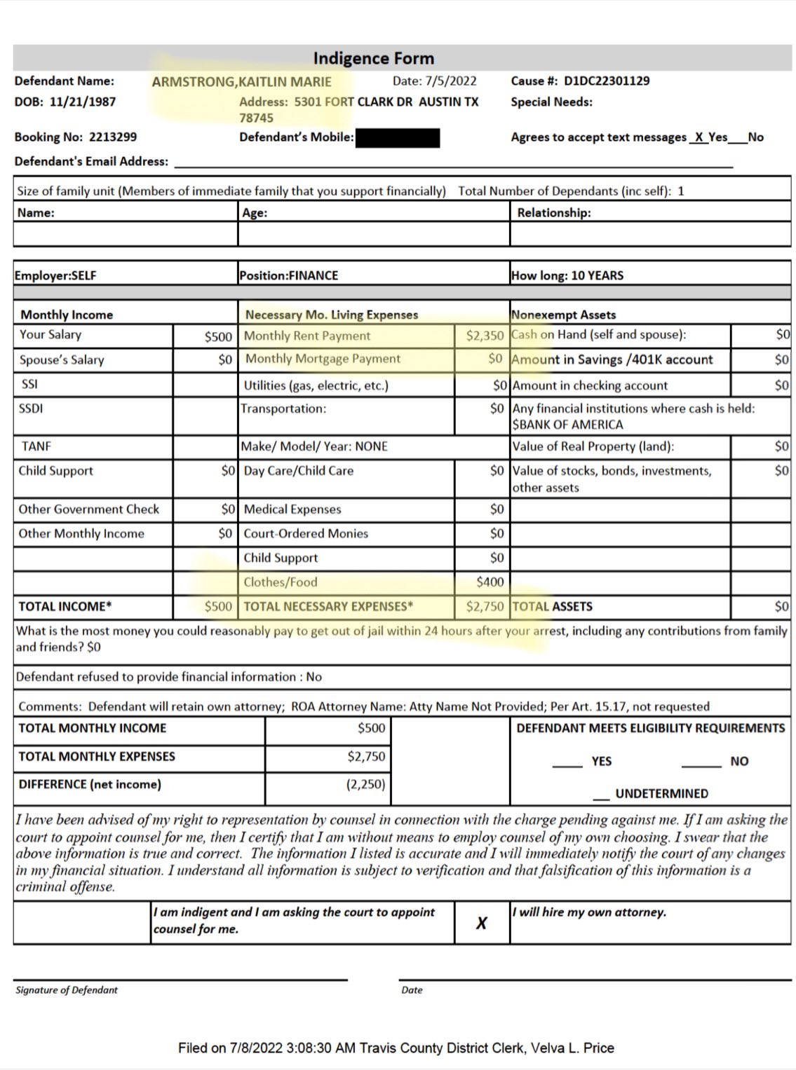 KA reporting monthly income at $500 is indigent by default (less than 125% Fed Guidelines). Effective 3/2/2022, Travis County 125% Federal Poverty Guidelines for HH of 1 = $1,416, and 2 = $1908.
