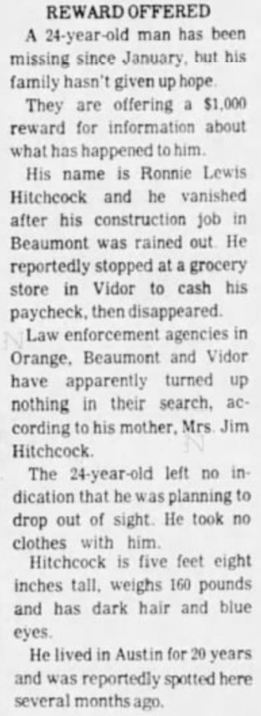 Circumstances of Disappearance: A report was filed with Texas Rangers in Vidor Texas and Beaumont Texas and with the FBI in Austin. Ronnie has been missing since Jan.1975.
