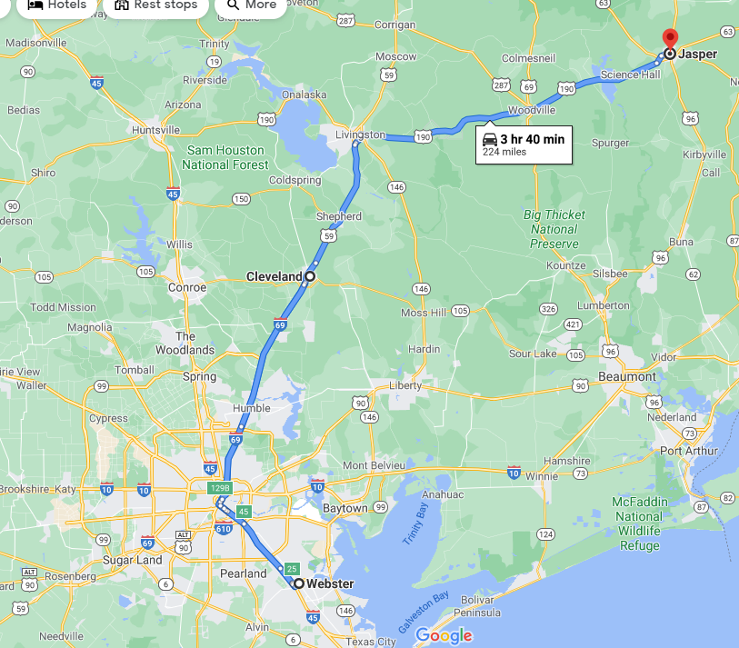 224 miles from Cleveland to Webster to Jasper one-way