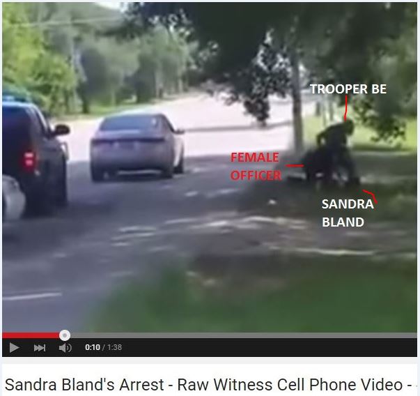 trooper is on her Left, Female office is over Sandra Bland, You can see the Trooper raise straight up he was kneeling on his right knee, gets up and goes to open female officer patrol car door, Trooper is who tells person video he needs to leave or whatever he said. View attachment 79257 [video=youtube;umOvM-bxXJI]https://www.youtube.com/watch?v=umOvM-bxXJI[/video]