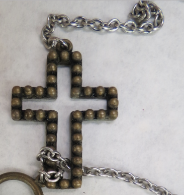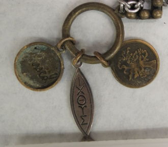A second pendant with multiple charms including a fish, a circle that says "BLESSED", and a metal circle with a tree