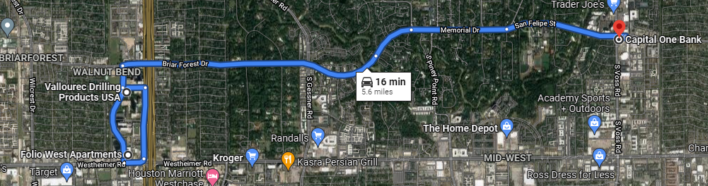 Now as far as either from his work or home to the Capital One off of Voss you are only looking at around 5 miles/16 minutes. The other Capital One off Westheimer is 2.7 miles/10 minutes away so the one off Voss is really not that far away or much further than the Westheimer one, just opposite directions with one being a few minutes further. IMO, I don't understand why the mother acts like she has no idea what he would be doing in that area. I have banks like that too, where one is a little closer but if I am getting food in the other direction I would stop at that one if I needed to go to the bank. I think he could have easily been doing the same thing so I am not sure why she finds it so implausible that he would have any reason to be in that area? But at the same time if his mother has no idea why he would go to the one in that area over the one closer then maybe he was going to meet someone?