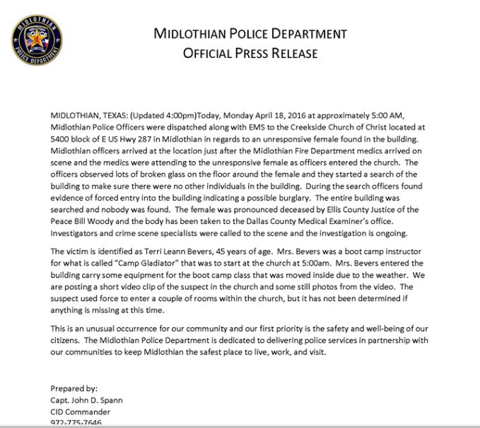 “This case is weighing heavy on the community and our investigative team. Our thoughts and prayers remain with the Bevers family and our entire Midlothian community. We will vigorously pursue the person or persons responsible and bring them to justice,” said Midlothian Police Chief Carl D. Smith.