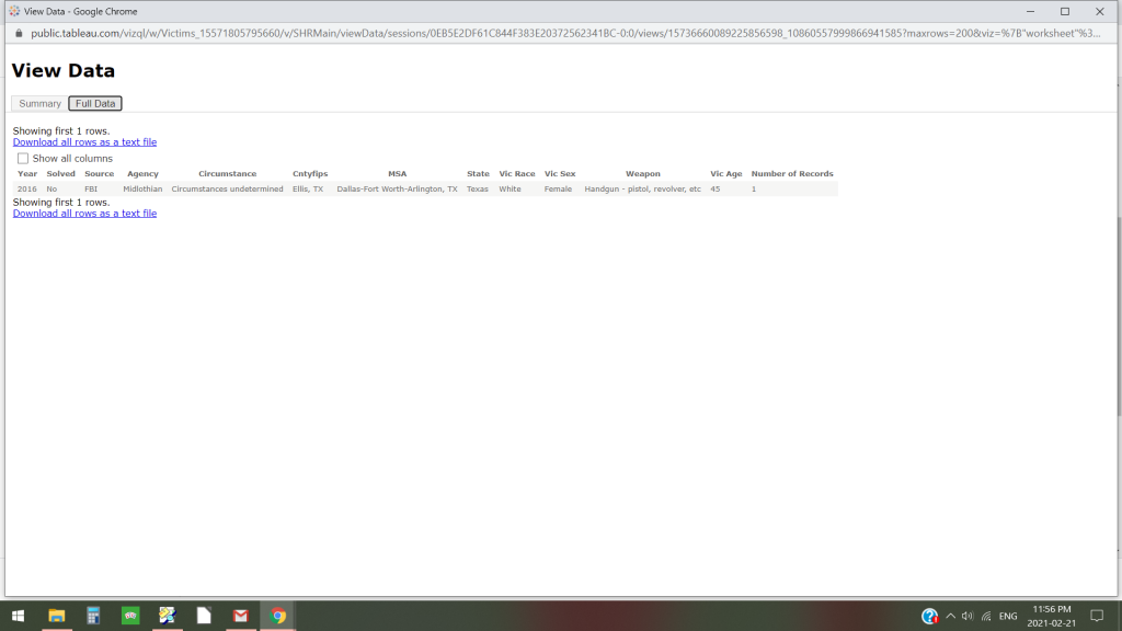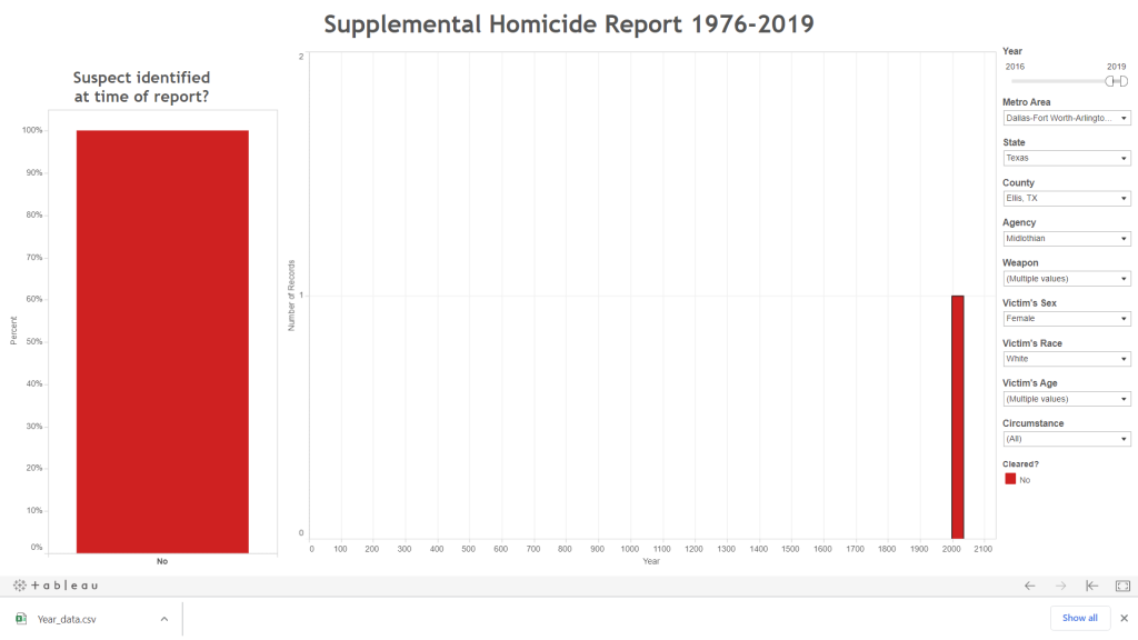 Okay, I got this far in the search and am still trying to figure out how to download the data *(see ETA note below). Under "Weapon", when I selected "Blunt instrument", nothing came up. It was only in selecting "Firearm, type not stated" and "Handgun - pistol, revolver, etc" that this one result came up.