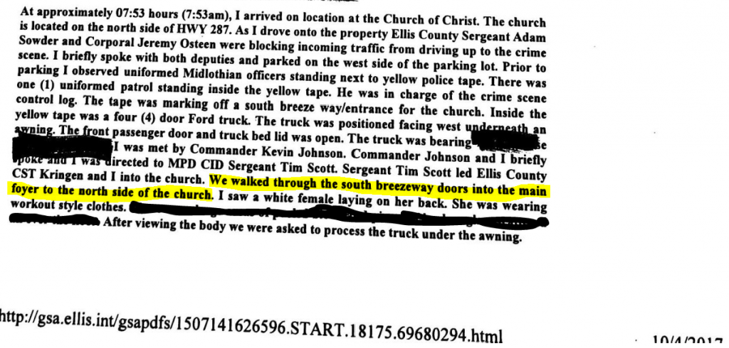 we know she wasn’t found at the south west of the building. The Ellis County CSI report states that the technician was led through the southwest entrance doors and continuing North into the foyer. His language is pretty clunky, but the best interpretation is that Missy was in the west entrance foyer, off the hallway. Definitely not the southwest corner. Whoever wrote the warrant probably just got the directions mixed up.
