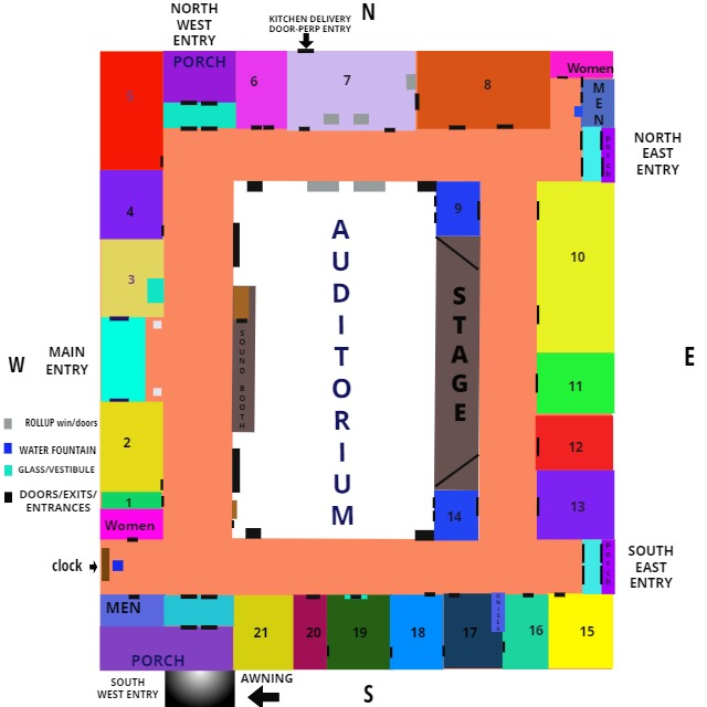 Missy entered thru the SW awning entrance, also called a breezeway by the CSI, also called a Porte Cochere by some. When weather was good the campers worked out in the parking lot. When it was a light drizzle they worked out under the awning, in the patio area that is right there by where Missy’s truck parked. When it was raining hard or the temp was 35 or below, they worked out inside the church. That morning, because it was raining hard, they were going to work out inside.
