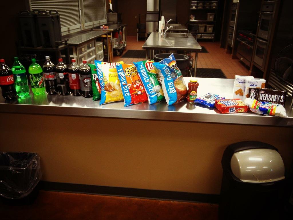 There is another kitchen photo with a door beside the ice machine, light is on and it appears to have a rack like would put pantry type items < JMHO this is a small room next to the room 6 not part of room 6 with doors at each side (hallway on one end and the door exit. I thinking maybe the frig and freezer are in this room . And that the room behind the stove and so forth that that is sink room and that it may extend down to the roll up door at that end of the room and room 8. Would make sense, put dirty dishes through that opening.