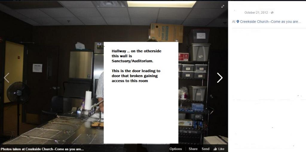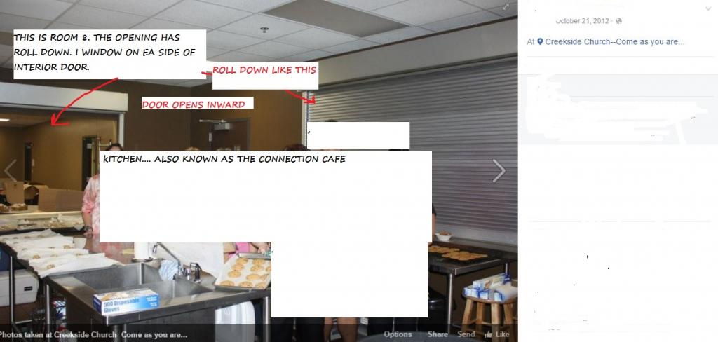 My opinion is she was somewhere inbetween the 2 doors on ea side of building in that main hallway. There also looks like a small hallway on other side of door opened prior to the bulletin board ? or maybe the Sanctuary door area. Somewhere in that area is where the Captain leads me to believe anyway by his wording. But I dont think was in the kitchen, personally. JMHO