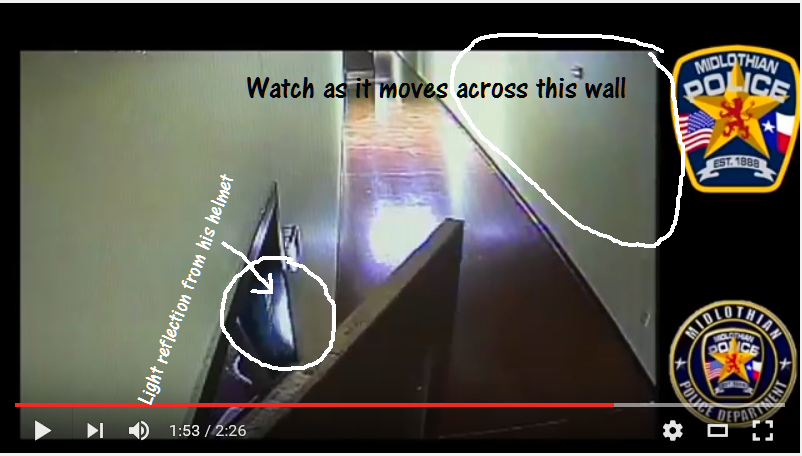 Bill Carson had a better shot of the perp walking out of a room and the light shined on the door jamb. I am 99% convinced the perp was wearing head lamp. It just was turned off some of the times. Probably on for darker rooms where the hallways did not need it.