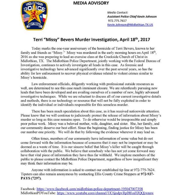 Today marks the one-year anniversary of the homicide of Terri “Missy” Bevers. Missy was murdered in the early morning hours on April 16th, 2016 as she was preparing to lead an exercise class at the Creekside Church of Christ in Midlothian, TX. The Midlothian Police Department, jointly working with the Federal Bureau of Investigation, remains actively investigating all leads in this case. As forensic and investigative technology has advanced significantly over the past several years, so has the ability for law enforcement to recover physical evidence related to violent crimes similar to Missy’s homicide.