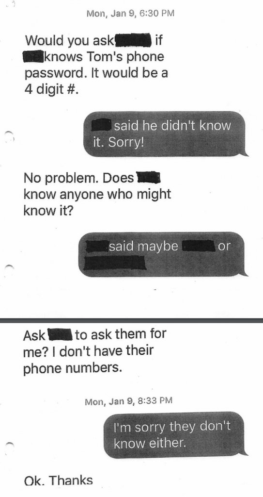  PENNY MEEK texted a witness in January of 2017 asking if their child knew the passcode to THOMAS BROWN’S phone and clarified this was a four-digit number. The child began asking numerous friends if they had the passcode. The circumstances surrounding the passcode created misinformation that HCSO had asked for the passcode in 2017. The investigative team has confirmed that HCSO did not ask the family for the passcode in 2017.