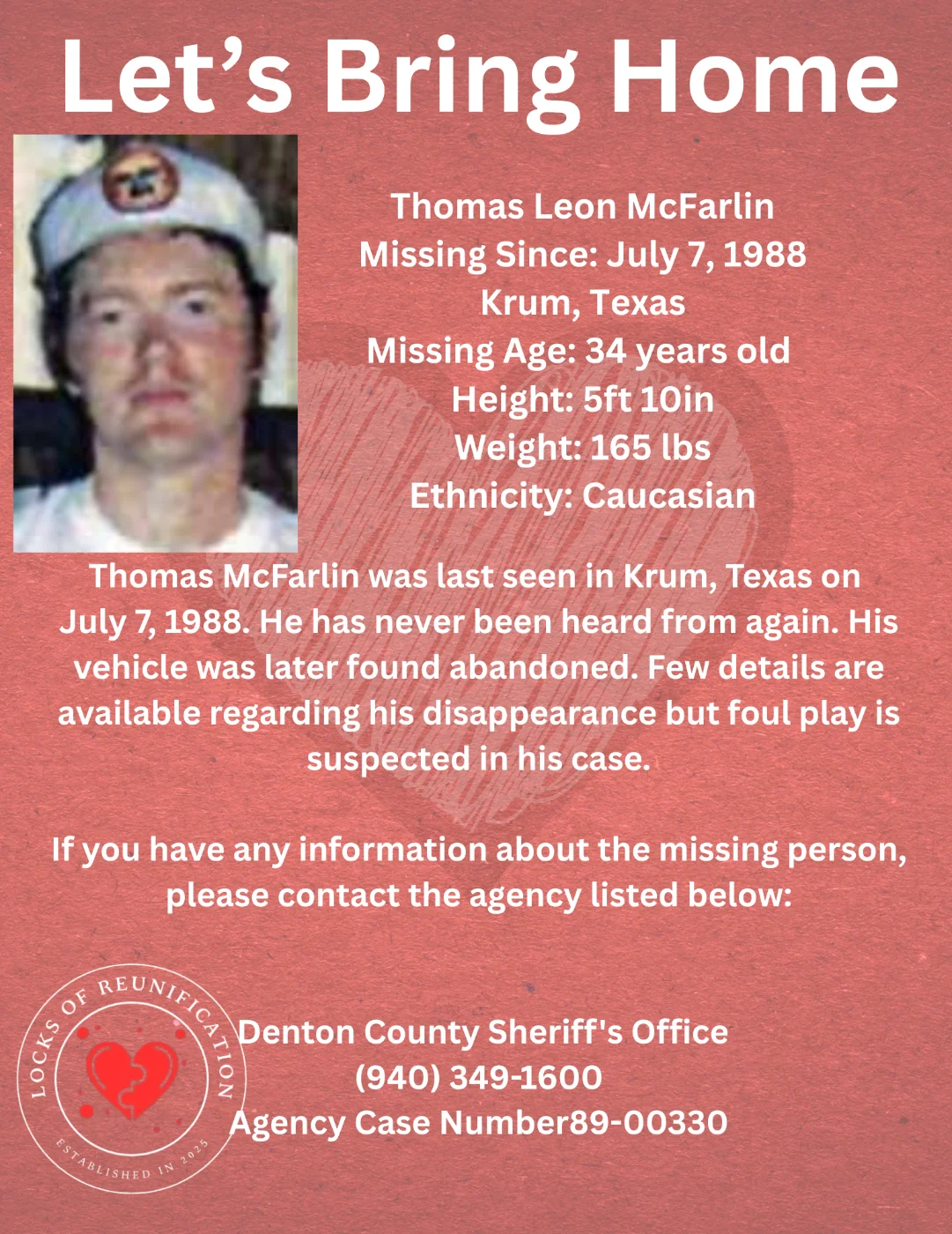 McFarlin was last seen in Krum, Texas on July 7, 1988. He has never been heard from again. His vehicle was later found abandoned. Few details are available regarding his disappearance but foul play is suspected in his case.