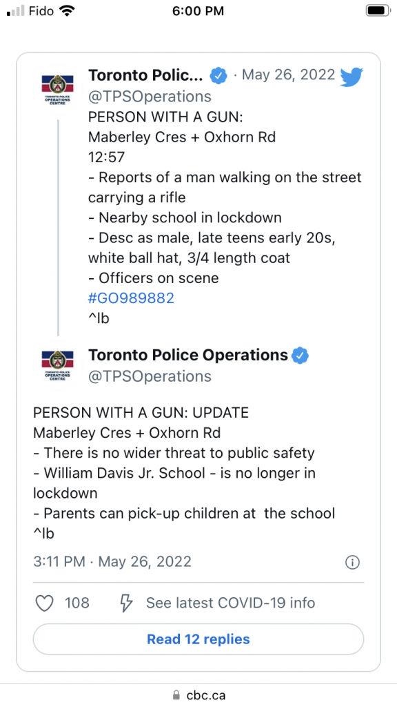 This is somewhat related, but some Toronto schools went into lockdown for over two hours this afternoon when a resident spotted a teen or young adult with a rifle close to schools.