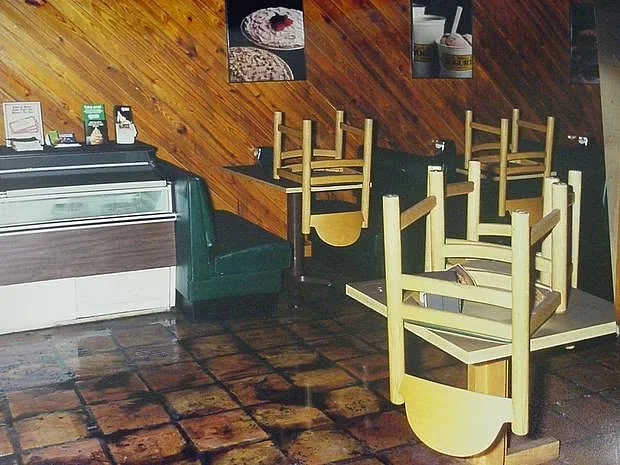 Eliza, Jennifer, Sarah, and Amy's bodies were found charred beyond recognition inside the storage room of the I Can't Believe It's Yogurt shop. Detectives theorized the girls were forced into the storage room by at least two men, forced to undress and then bound by their undergarments. Pictured is an interior view of the restaurant