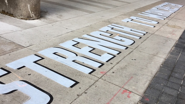 Sidewalk art featuring the phrase 'Strength to Manchester' on Bay Street at College Street, in Toronto on May 23, 2017. (Linda Kelly/CBC)