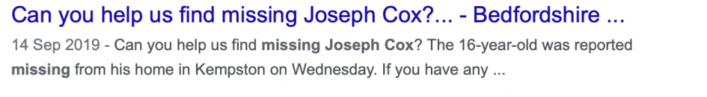 Aged 15, missing again, this time from the Barnet area. Missing since July 23rd 2019 till unknown, but found again as he goes missing again a year later.