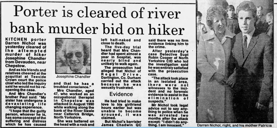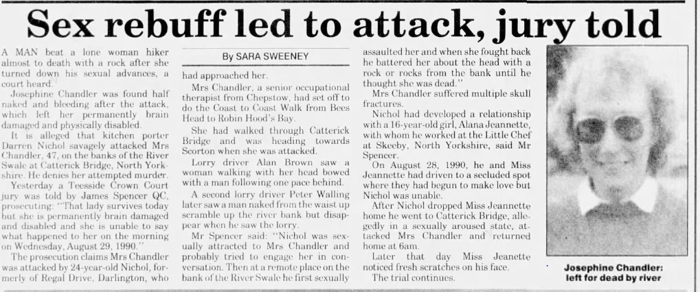 The attack of Jo Chandler happened in North Yorkshire & that of Ann Heron in County Durham, HOWEVER these were only 15 miles and 23 days apart.