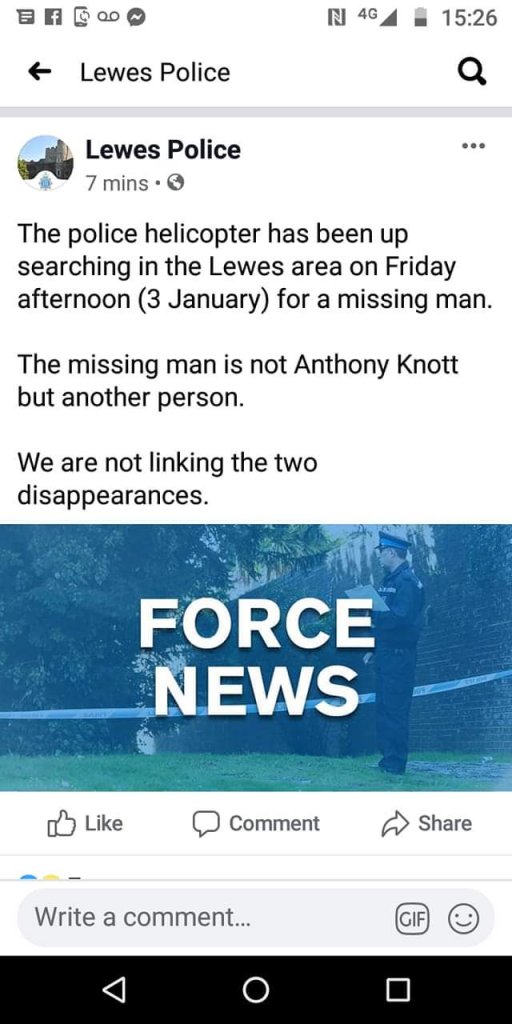 Well this is a peculiar turn of events! So from what I can make out from Lewes Present is that as others have said, a bottle was seen in the river. Possibly attached to a fishing road and possibly with a note in it. Police are categorically saying it is not related to Anthony but no one seems aware of another missing person. The well meaning admin for LP facebook posted this morning that it's not a police matter, please do not go near for your safety. He has now posted a comment which suggests he was incorrect earlier as it was a police matter and a statement will be made by LE possibly tomorrow. In response to a comment on their facebook page, LE have referred to a victim.