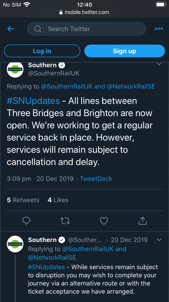 I've found this tweet by Southern Railway at 1.21pm on that day, but I'm not sure if it would have affected AK's route or not.