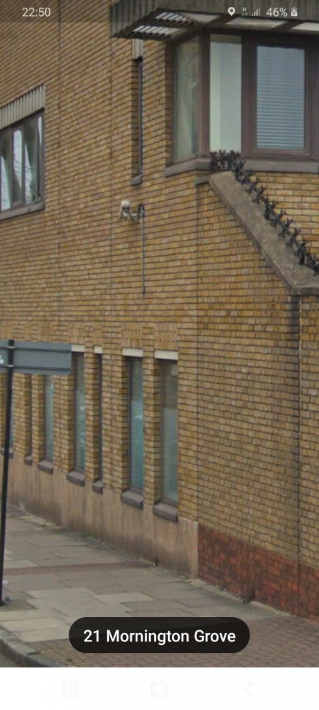 Looking at turning into Mornington Grove, there is another CCTV on the court building (1), but may only capture someone on that side of road, which he may probably not have been.