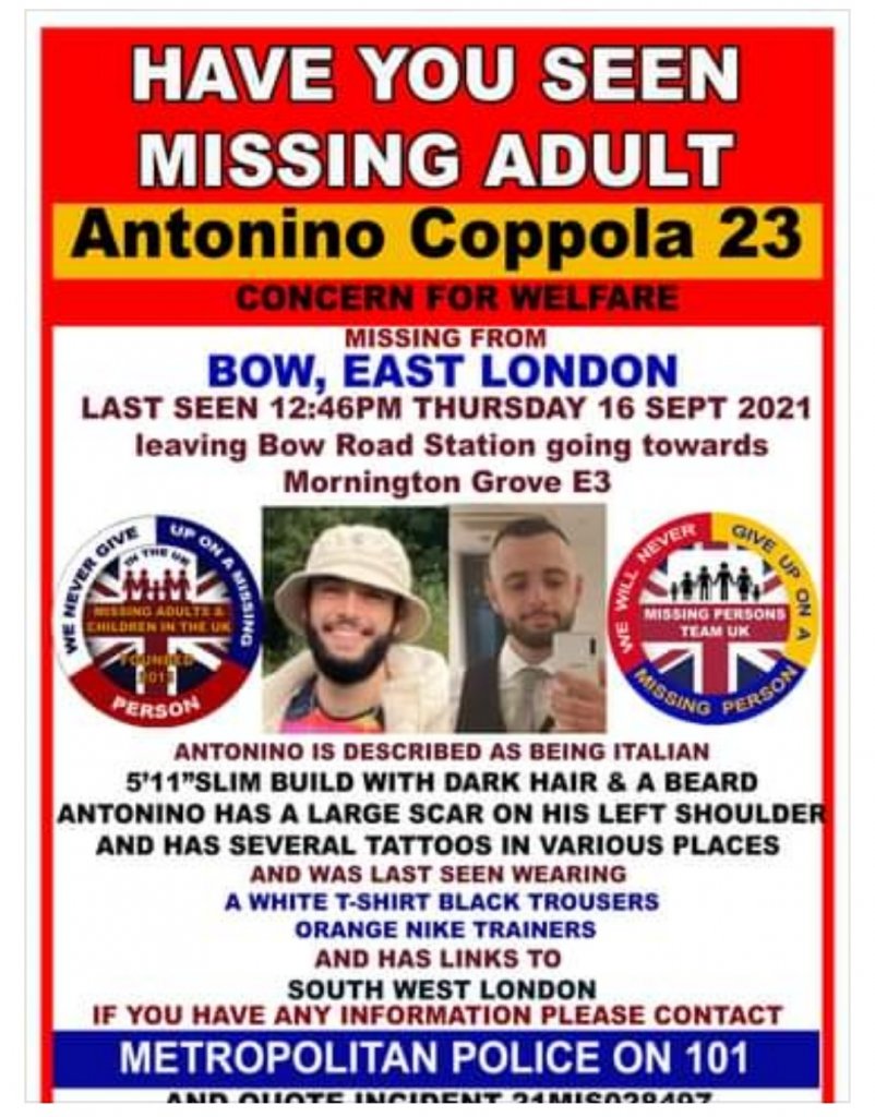 Antonino Coppola, 23, was last seen on Thursday, 16 September at around 12.46pm leaving Bow Road Station towards Mornington Grove.