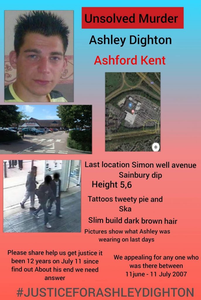 Im also making an appeal to find out who mayb was around ashford kent on the 11th june and may of seen my brother or people acting suspicious or mayb someone has heard rumours bout my brothers death please can you get in contact with me i have a facebook group called i want justice for my brother ashley dighton