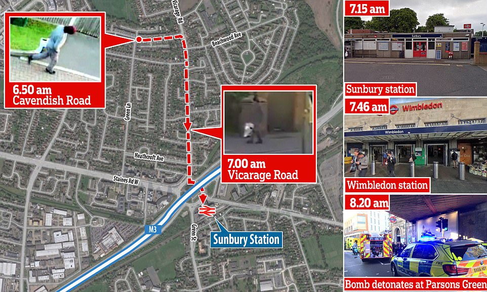The suspect is believed to have caught the 7.15am service to Wimbledon, arriving at 7.46am. Detectives will be investigating why he appears to have waited in Wimbledon for up to 25 minutes and if he met anyone before boarding the District Line train where at least 30 people were injured.
