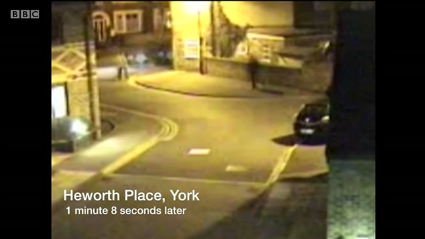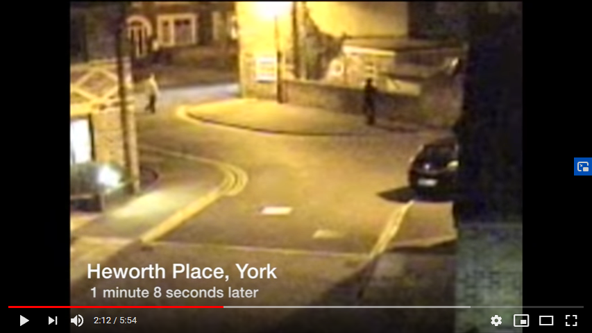 If you look at the footage when the light person crosses the rd he is in fact accompanied by at least one other person wether its him or the other person that aids male 1 to carry the other I cannot tell because the carrying of the man happens right on the corner and the second man is always behind the building. I believe the man/rucksack could possibly be put into a passing car but equally I have suspicion that one of the terrace of houses on heworth rd may have been used that night.