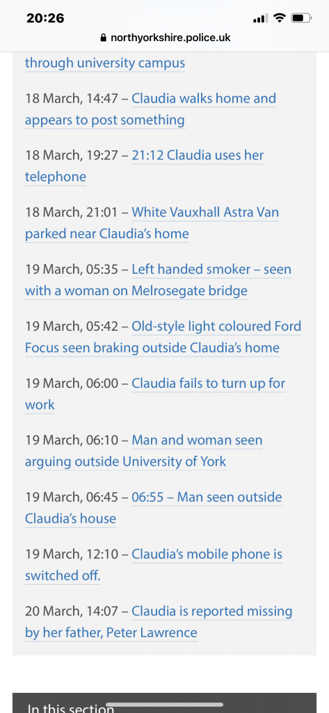 My point here is I can quote the left handed smoker till I am blue in the face - if I cannot tie him in to Claudia's disappearance then what is the point. Alleyway man may of done the manoeuvre twice but what was he doing? Why did Claudia stop using her phone at 8.23pm on the 18th March 2009? Where is her rucksack? when did Claudia leave her house on Heworth Road? Why would someone want to kill Claudia? These are the questions we need to answer. There are would be Sleuths involved, researching this case since its outset in 2009 - give me some theories based on evidence, or logical sound reasoning, probability. Having been on this "Websleuths" or a few weeks, I am disappointed. I have not read anything that leads me to believe anyone has a clue about what happened to Claudia. Case Closed - No further action.