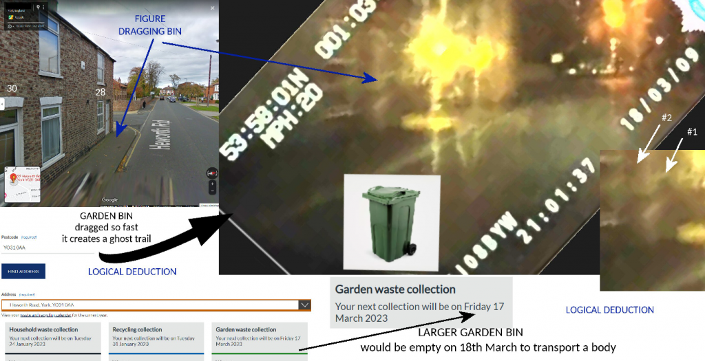 There would need to be a van or pick up to transport this type of bin, assume it would only be used to take around to the alley at the back. Presume never tested for DNA? Best footage I have seen up to