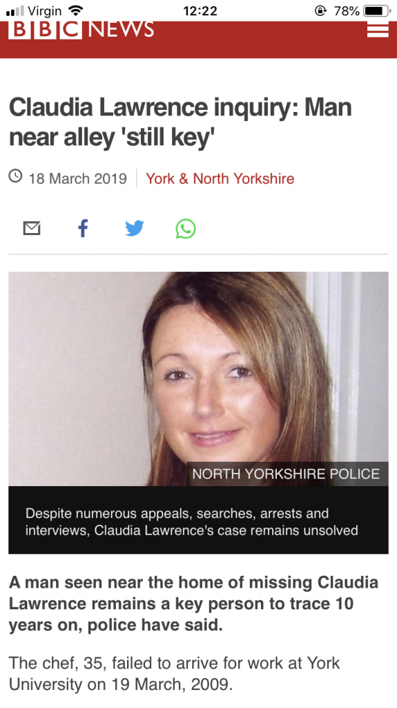 I looked at this one and she also gave a description of the person responsible. What I found interesting is that this was quite soon after Claudia went missing:- Psychic: Claudia is in an isolated wood - the description of the person - “I kept picking up this bloke, a skinny, dark-haired guy with high cheekbones and a sallow complexion. His eyes were quite far apart and he had a pointy chin."