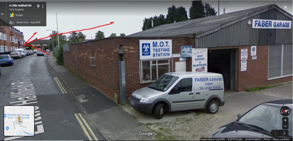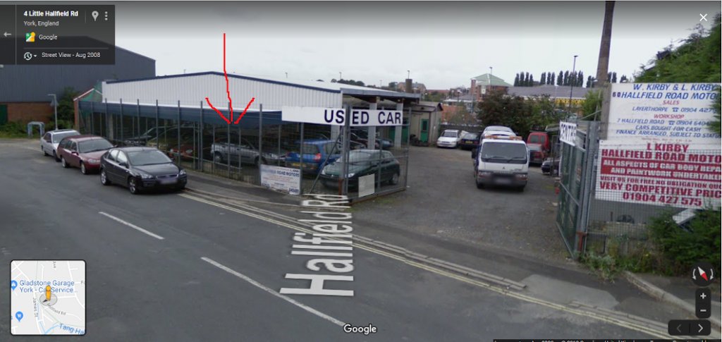 just as interest where the apartments are I mentioned on little hallfield (arrowed) on the end of the road is a garage well 2 actually now I study the photo both well capable of repairing cl car..opposite is a car sales pitch and ooohh look a 5 door light coloured ford focus. ok theres thousands of ford focuses..the pics are aug 2008 so chances are they sold the car by 2009....just an odd coincidence and looking round the streets there are oodles of light coloured focus`s in 2008