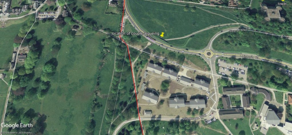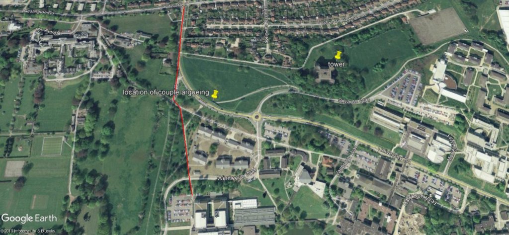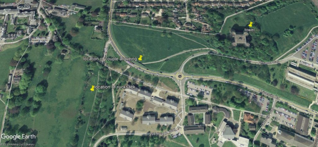the most likely route..pin for couple arguing is a rough guide as it was described as near the bridge...in the documentary the ex cop described the rucksack as been seen by a path cl used to cut through to the uni..
