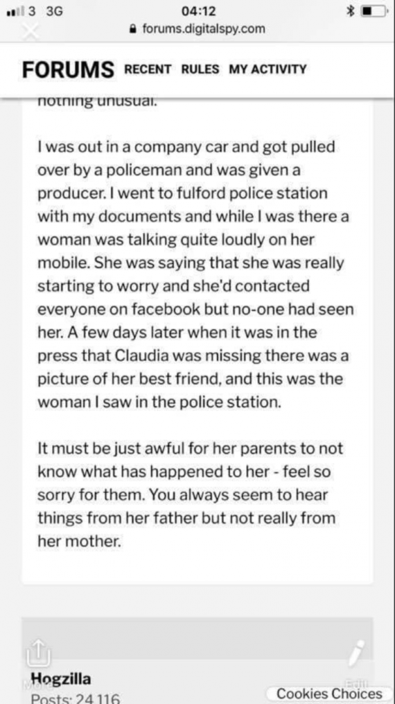 2D8F4468-1C9A-4687-A9A7-C3A3339E3B44.png DB722225-7302-45E9-8B75-831EF4688136.png 6F3F672A-9516-4925-9320-7EB678255773.png Suzy cooper previously said peter lawrence reported Claudia missing via call and at the police station, and police came down to the nags head pub to speak to her friends.then another article speaks of suzy and Jen saying they were at the police station and peter came in saying this sort of thing never happens to us. But this lady stated suzy went into the police station alone and reported her friend missing? Why is is so difficult to get basics cleared up! Which one is correct?