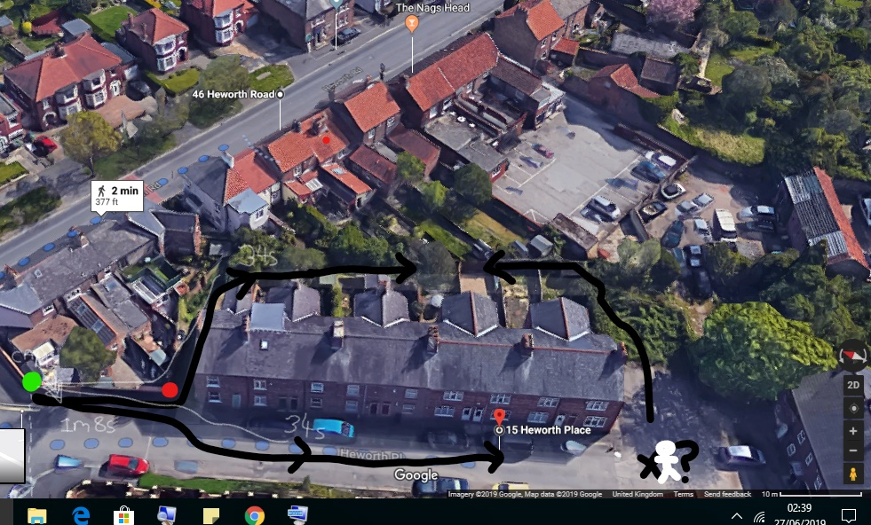 When Dark Guy goes out of cctv shot before reappearing, on both vids, is that the Alleyway indicated by the start of the Pink line on the overhead shot of houses etc?