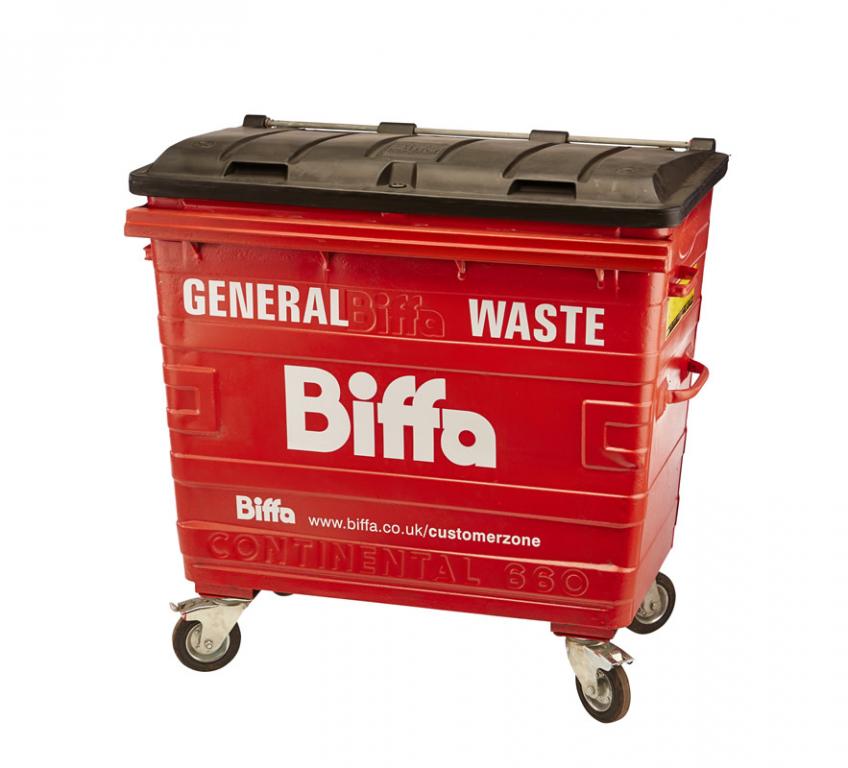 The bin was the one saying "Biffa" in the picture. Biffa own the other 2 red ones but these are almost certainly general waste (as they would have been emptied on the day too). The blue bin is for cardboard only and is probably barely used but in theory the owner of these bins should be separating recyclables from cardboard.