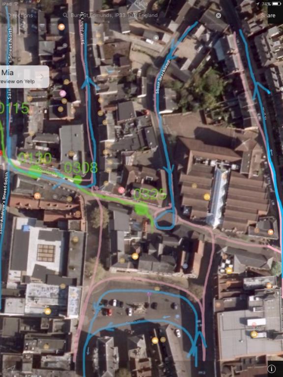 The small area where the bins are and where cars can park *out of view of the CCTV* is the dead end talked about. Coming out of this small area and taking one of the 3 possible routes out the area *on foot* Corrie would have been seen on CCTV (as he was in the 2nd CCTV) and probably by other people but wasn't.