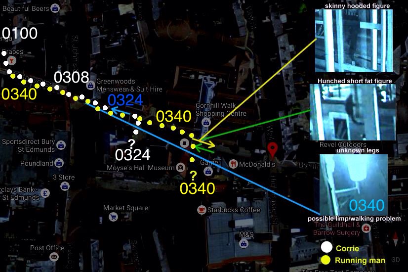 The image I've just posted of the 'legs and running man' bolster that thought. Corrie's CCTV was 0324 with the 'swinging basket gate'. The woman in this latest CCTV footage suggests its 0340. That could so easily be the same person. Same side, skulking, dark figure, hugging the wall to avoid detection...!