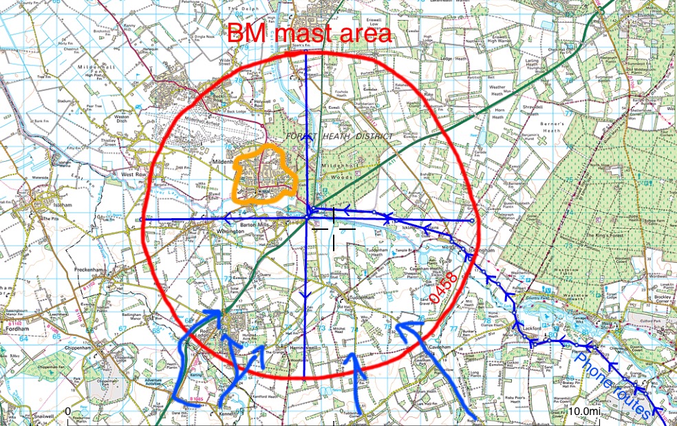 In additions to my images and mast area comments. You have to bare in mind that the mast may not give 100% coverage. For example, my initial research suggests that there is very limited coverage (if any at all) around the old Celtic Iron Age farm and Fordham areas. Additionally, a large stretch of road leading towards the BM mast is exceptionally limited if not none existent.