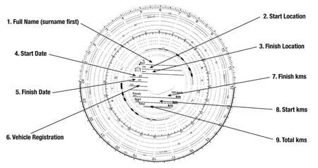 At the beginning of the day the driver must fill in 1, 2, 4, 6 and 8. At the end of the day the driver must fill in 3, 5 and 7.