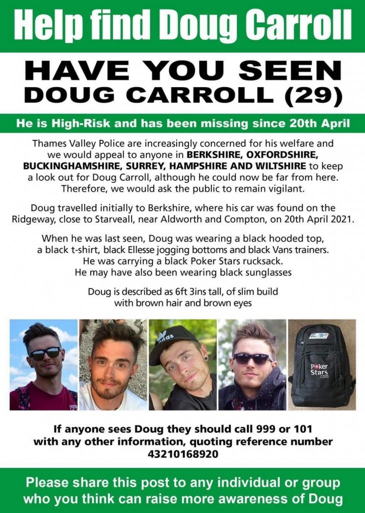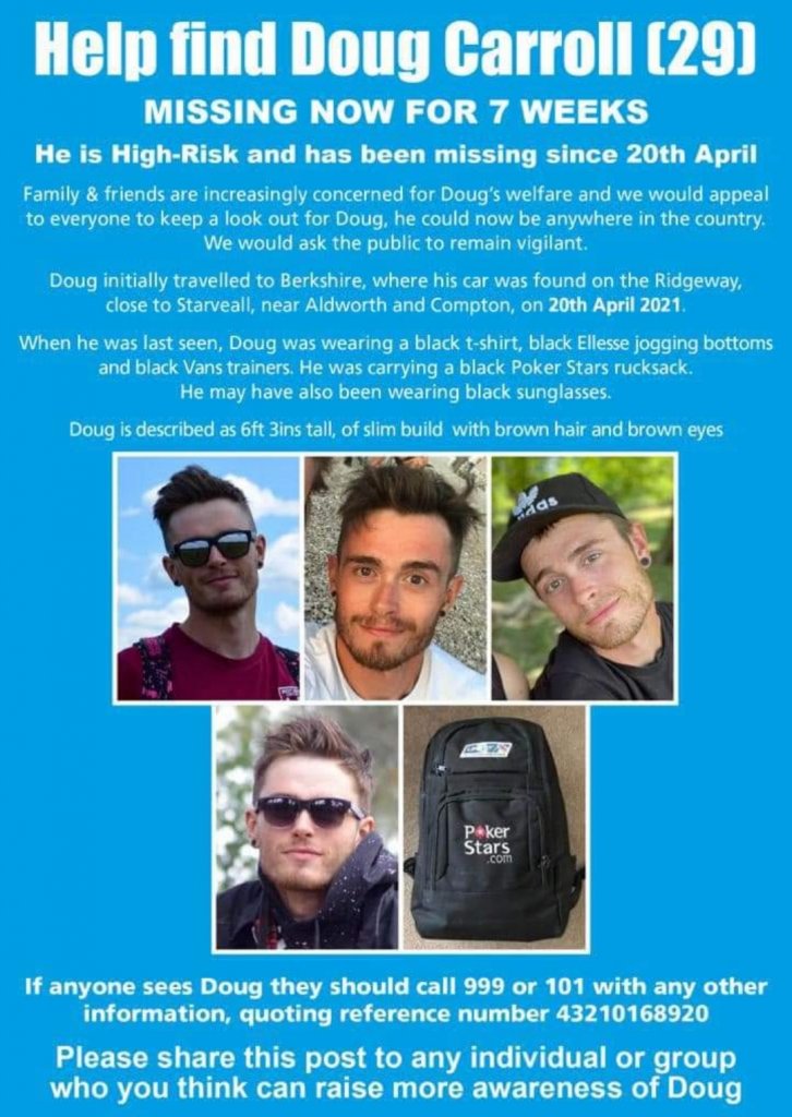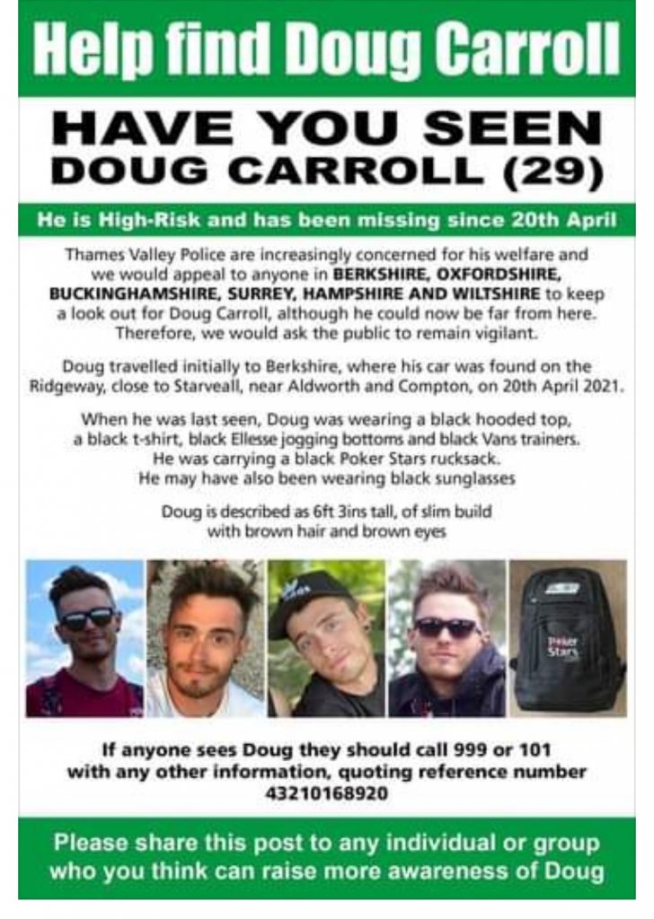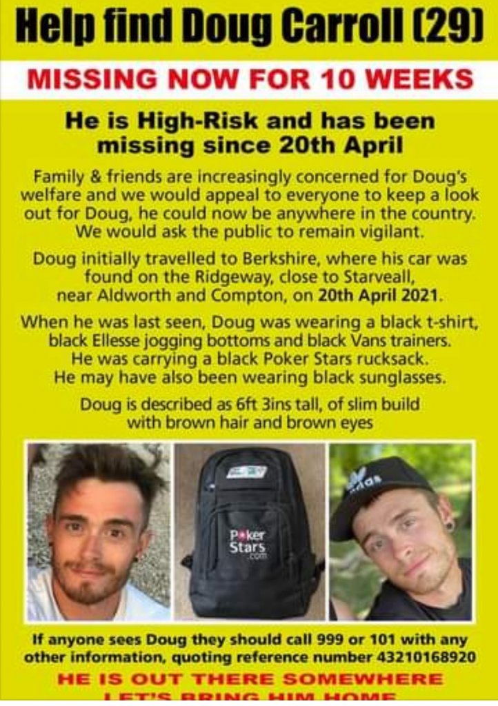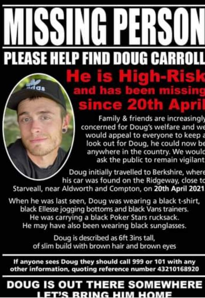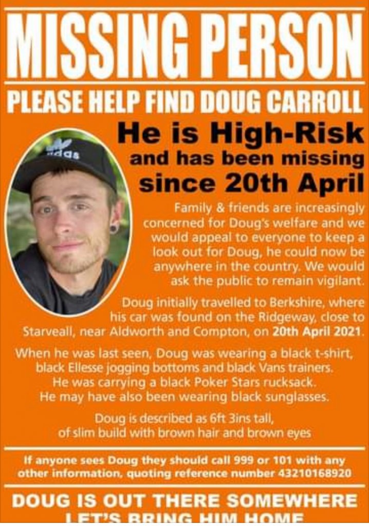 I'm in two (OK, three) minds as to whether Thames Valley Police have dropped the ball, whether the family is not supportive of a high profile campaign for whatever reason, or whether this is genuinely a more problematic disappearance than many. Is it administrative? The Ridgeway crosses the border between the Thames Valley Police area into the Wiltshire Police area. Has Doug been caught in the crossfire of an argument about who pays for the drones and the dogs? I can hardly believe it, and yet frustratingly little seems to have been attempted except a lot of postering that has achieved nothing as far as I can see.