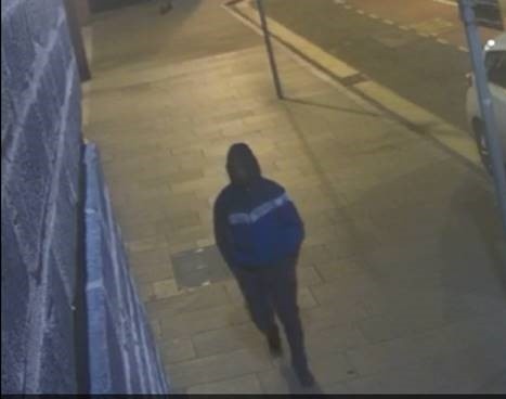 In the CCTV image he is wearing a distinctive dark coloured jacket with a white stripe across the chest and his left arm.
