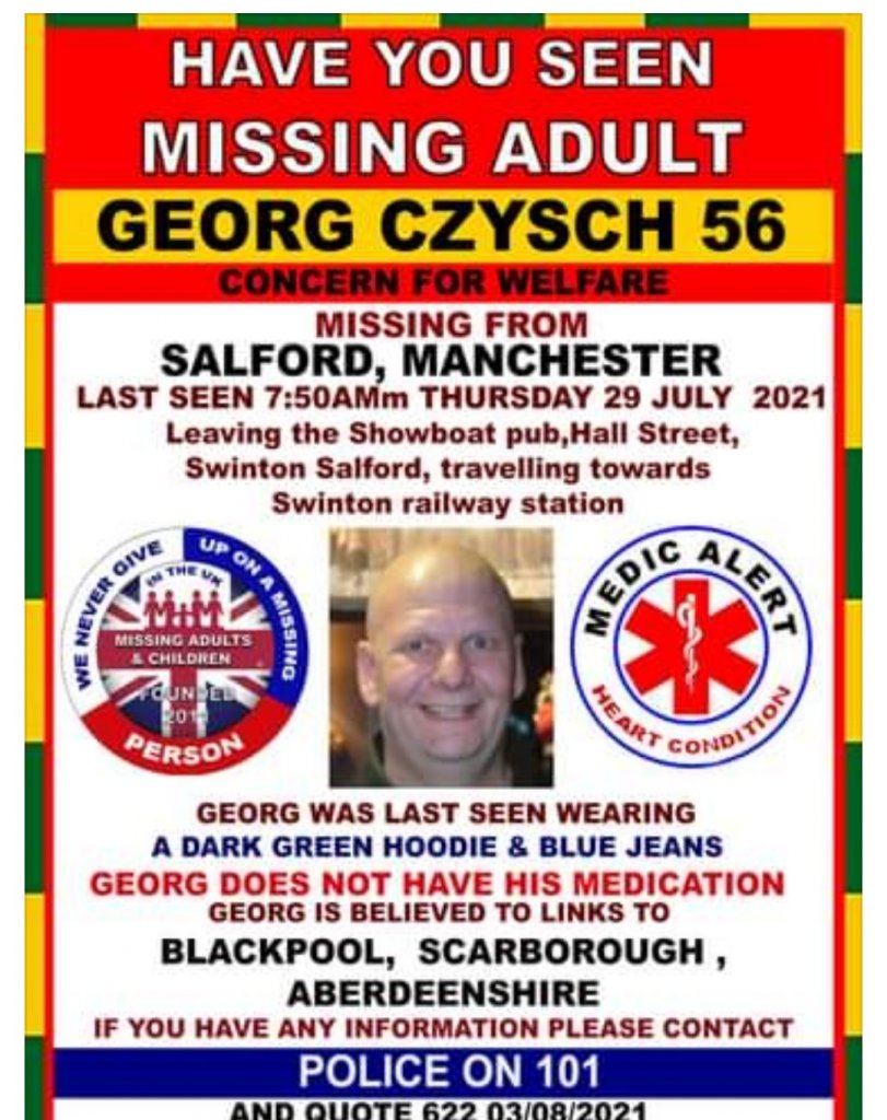 Georg Czysch, 56, was last seen walking out of the Showboat pub on Hall Street in Swinton, Salford, at 7.50am in the morning.